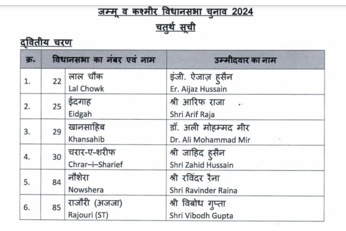 चौथी लिस्ट में बीजेपी ने छह उम्मीदवारों का ऐलान किया है. पार्टी ने लाल चौक विधानसभा सीट से एजाज हुसैन, ईदगाह सीट से आरिफ रजा, खानसाहिब से अली मोहम्मद मीर, चार-ए-शरीफ से जाहिद हुसैन और राजौरी (एसटी) सीट से विबोध गुप्ता को अपना उम्मीदवार बनाया है.