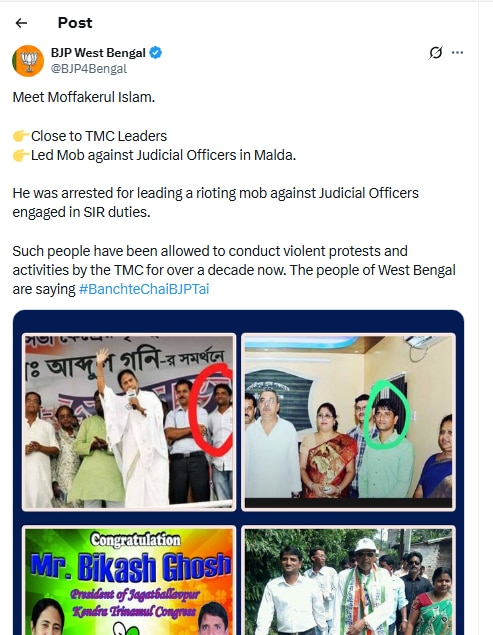 इसके करीब 35 मिनट बाद BJP ने पलटवार किया. पार्टी ने इस्लाम की कई TMC नेताओं के साथ तस्वीरें शेयर कीं, जिनमें से दो में वह ममता बनर्जी के साथ एक पोस्टर पर थे और एक अन्य में वह उनके साथ स्टेज पर थे. BJP ने ट्वीट किया, 'मिलिए मोफक्करुल इस्लाम से. TMC नेताओं का करीबी, मालदा में ज्यूडिशियल अधिकारियों के खिलाफ भीड़ को लीड किया. इसे SIR ड्यूटी में लगे ज्यूडिशियल अधिकारियों के खिलाफ दंगाई भीड़ को लीड करने के लिए गिरफ्तार किया गया है. ऐसे लोगों को TMC ने एक दशक से ज़्यादा समय से हिंसक विरोध और एक्टिविटी करने की इजाजत दी है.'