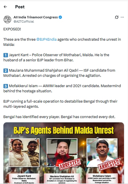 TMC ने शुक्रवार दोपहर 2.55 बजे ट्वीट करते हुए लिखा, 'ये तीन BJP एजेंट हैं, जिन्होंने मालदा में अशांति फैलाई. जयंत कांत मोथाबारी, मालदा का पुलिस ऑब्जर्वर है. वह बिहार के एक सीनियर BJP नेता का पति है. मौलाना मुहम्मद शाहजहां अली कादरी मोथाबारी से ISF उम्मीदवार, जिसे आंदोलन करने के आरोप में गिरफ्तार किया गया. मोफक्करुल इस्लाम AIMIM नेता और 2021 के उम्मीदवार, बंधक बनाने की घटना के पीछे का मास्टरमाइंड. BJP अपने कई लेयर वाले एजेंटों के जरिए बंगाल को अस्थिर करने के लिए बड़े पैमाने पर ऑपरेशन चला रही है.'