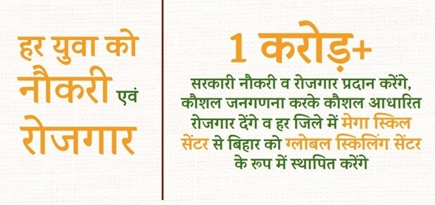 हर जिले में अत्याधुनिक मैन्यूफैक्चरिंग यूनिट लगाने, 10 नए औद्योगिक पार्क विकसित करने, कौशल जनगणना कराकर कौशल आधारित रोजगार देने, हर जिले में मेगा स्किल सेंटर से बिहार को ग्लोबल स्किलिंग सेंटर के रूप में स्थापित करने का वादा भी सत्ताधारी गठबंधन ने किया है.