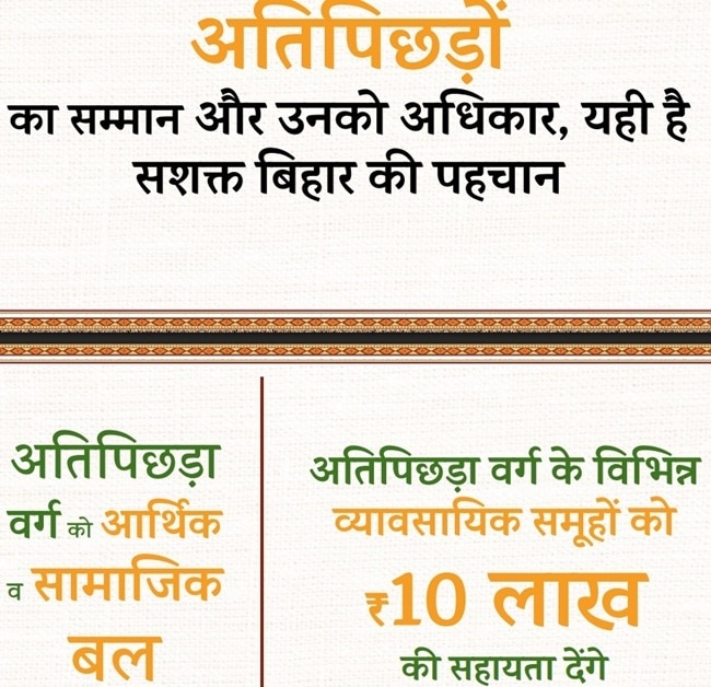 एनडीए ने अति पिछड़ा वर्ग (ओबीसी) के आर्थिक-सामाजिक सशक्तिकरण के लिए विभिन्न व्यावसायिक समूहों को 10 लाख रुपये की सहायता देने का भी वादा किया है.