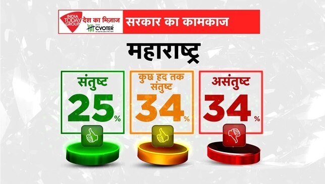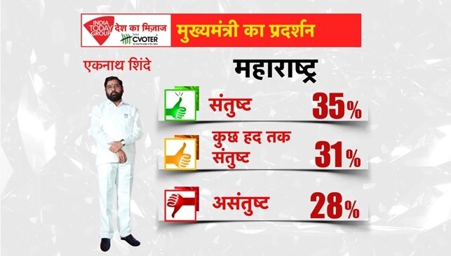 इस सर्वे के मुताबिक सरकार के काम से जहां 25 फीसदी लोग संतुष्ट हैं, वहीं सीएम शिंदे के काम से संतुष्ट लोगों की संख्या 35 फीसदी है. सरकार के काम से 34 फीसदी लोग कुछ हद तक संतुष्ट हैं लेकिन सीएम के काम की बात आती है तो ये आंकड़ा भी 31 फीसदी पर आ जाता है. सीएम के काम से असंतुष्ट लोगों की संख्या भी सरकार के मुकाबले कम है. सरकार के काम से जहां 34 फीसदी लोग असंतुष्ट हैं, वहीं सीएम के काम से 28 फीसदी. बतौर सीएम एकनाथ शिंदे के बढ़े ग्राफ को परसेप्शन लड़ाई में उद्धव के मुकाबले आगे निकलने का संकेत भी कहा जा रहा है.
