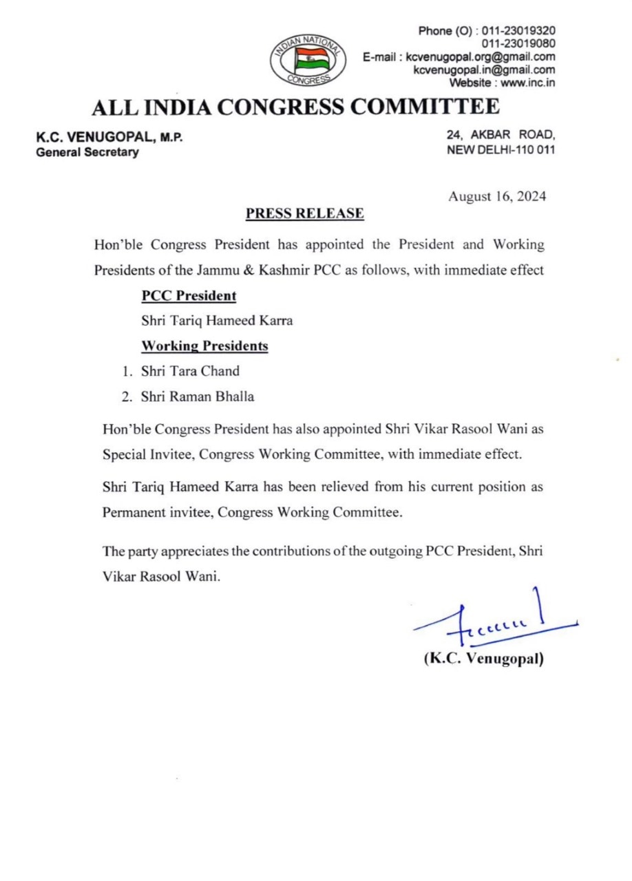 अखिल भारतीय कांग्रेस कमेटी की ओर से जारी आधिकारिक तौर पर कहा गया है कि कांग्रेस अध्यक्ष मल्लिकार्जुन खड़गे ने तत्काल प्रभाव से जम्मू और कश्मीर पीसीसी के अध्यक्ष और कार्यकारी अध्यक्षों की नियुक्ति की है. पीसीसी अध्यक्ष तारिक हामिद कर्रा होंगे, जबकि कार्यकारी अध्यक्ष की जिम्मेदारी तारा चंद और रमन भल्ला को दी गई है.