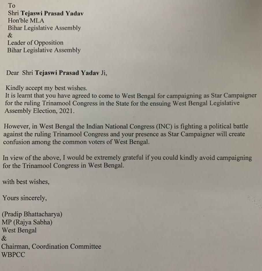 प्रदीप भट्टाचार्य ने अपनी चिट्ठी में लिखा है कि कांग्रेस पार्टी बंगाल में तृणमूल कांग्रेस के खिलाफ चुनाव लड़ रही है, ऐसे में अगर आप यहां टीएमसी के पक्ष में प्रचार करेंगे तो वोटरों के बीच में कन्फ्यूजन पैदा होगा.