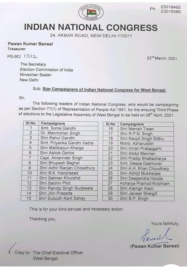 बंगाल में कांग्रेस के लिए चुनाव प्रचार करने वालों में अब्दुल मन्नान, प्रदीप भट्टाचार्य, दीपा दासमुंसी, एएच खान चौधरी, दीपेन्द्र हुड्डा, आचार्य प्रमोद कृष्णनम, आलमगीर आलम, बीपी सिंह, इमरान प्रतापगढ़ी के नाम भी शामिल हैं.