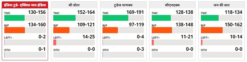 बता दें कि इंडिया टुडे-एक्सिस माय इंडिया के एग्जिट पोल में बीजेपी को बंगाल में 134 से 160 सीटें मिलने का अनुमान जताया गया है. एग्जिट पोल के मुताबिक सत्ताधारी टीएमसी 130 से 156 सीटों पर सिमट सकती है.