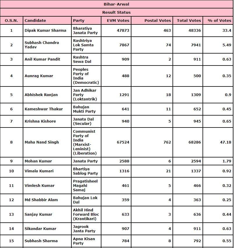 बिहार के जहानाबाद लोकसभा क्षेत्र के तहत आने वाली अरवल विधानसभा सीट (Arwal Assembly constituency) पर किसी खास पार्टी का कभी भी दबदबा नहीं रहा है. अरवल सीट पर इस बार बीजेपी-लेफ्ट के बीच मुख्य मुकाबला रहा. जिसमें भाकपा माले यानी लेफ्ट के महानंद प्रसाद ने बीजेपी के दीपक शर्मा को हराया है. महानंद प्रसाद ने 19950 वोटों के अंतर से जीत हासिल की है. बता दें कि अरवल विधानसभा सीट पर इस बार 28 अक्टूबर को वोट डाले गए और कुल 55.67% मतदान हुआ.