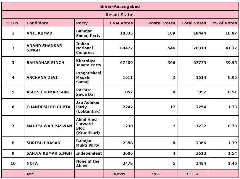 बिहार की औरंगाबाद विधानसभा सीट (Aurangabad Seat) पर भाजपा-कांग्रेस के बीच दिलचस्प मुकाबले में आनंद शंकर सिंह ने जीत हासिल की है. उन्होंने अपने निकटतम प्रतिद्वंदी रामाधार सिंह को हराया है. बता दें कि औरंगाबाद सीट पर महागठबंधन की ओर से कांग्रेस उम्मीदवार आनंद शंकर सिंह चुनाव लड़े जबकि एनडीए खेमे से भाजपा प्रत्याशी रामाधार सिंह चुनावी रण में उतरे. वहीं, राष्ट्र सेवा दल से आशीष कुमार सोनी, जन अधिकार पार्टी से चंदेश प्रसाद गुप्ता और बहुजन समाज पार्टी से अनिल कुमार ने अपनी किस्मत आजमाई. बता दें कि औरंगाबाद विधानसभा सीट पर पहले चरण में यानी 28 अक्टूबर को मतदान हुआ और कुल 53.12 फीसदी वोटिंग हुई.