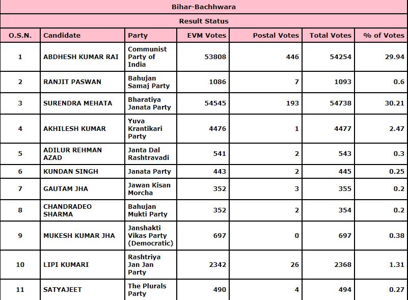 बछवाड़ा विधानसभा सीट से कड़ी टक्कर में बीजेपी के सुरेंद्र मेहता जीतने में कामयाब रहे. बेगूसराय लोकसभा क्षेत्र के तहत आने वाली इस सीट पर सुरेंद्र मेहता ने अपने निकटतम प्रतिद्वंदी सीपीआई के अवधेश कुमार को 484 मतों से मात दी. सुरेंद्र मेहता को 54738 (30.21%)वोट मिले जबकि अवधेश कुमार को 54254 (29.94%) वोट मिले. वहीं युवा क्रांतिकारी पार्टी के अखिलेश कुमार के खाते में 4477(2.47%) मत दर्ज किए गए. इस सीट पर तीन नवंबर को मतदान हुए जिसमें 60.64% पोलिंग हुई थी.