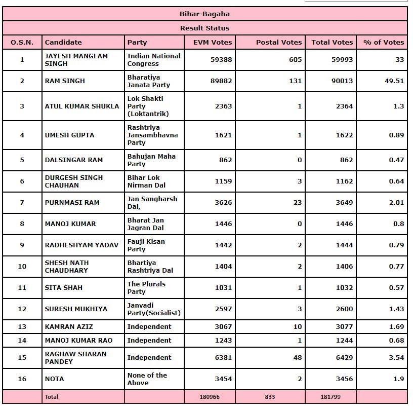 बगहा विधानसभा सीट पर भारतीय जनता पार्टी के राम सिंह ने जीत हासिल की है. उन्होंने कांग्रेस के जयेश मंगलम सिंह को 30020 मतों के अंतर से हराया. पहले भी यह सीट बीजेपी के पास थी.