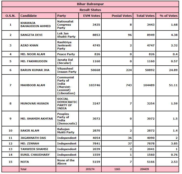 बिहार विधानसभा की सभी 243 सीटों पर मतगणना देर रात खत्म हुई. बलरामपुर सीट से CPI (ML) के महबूब आलम ने रोमांचक मुकाबले में बाजी मारी. उन्होंने VIP के वरुण कुमार झा को शिकस्त दी. यहां तीसरे चरण के तहत 7 नवंबर को 60.96% वोटिंग हुई थी. बलरामपुर से 14 उम्मीदवार मैदान में थे.