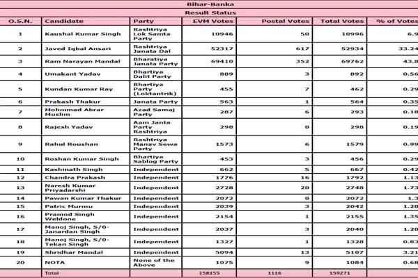 चुनाव आयोग के आंकड़े के मुताबिक, राम नारायण मंडल को 69762 वोट मिले. वहीं जावेद इकबाल अंसारी के खाते में 52934 वोट पड़े. बांका विधानसभा सीट पर 19 उम्मीदवार मैदान में थे.