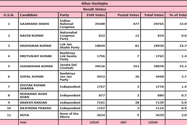 बिहार की बरबीघा विधानसभा सीट पर कांटे का मुकाबला देखने को मिला. यहां पर जेडीयू के सुदर्शन कुमार ने महज 113 वोटों से जीत हासिल की. चुनाव आयोग के आंकड़े के मुताबिक, सुदर्शन कुमार को 39878 वोट मिले. वहीं, कांग्रेस के गजानंद शाही के खाते में 39765 वोट पड़े. बरबीघा विधानसभा सीट पर 10 उम्मीदवार मैदान में थे.