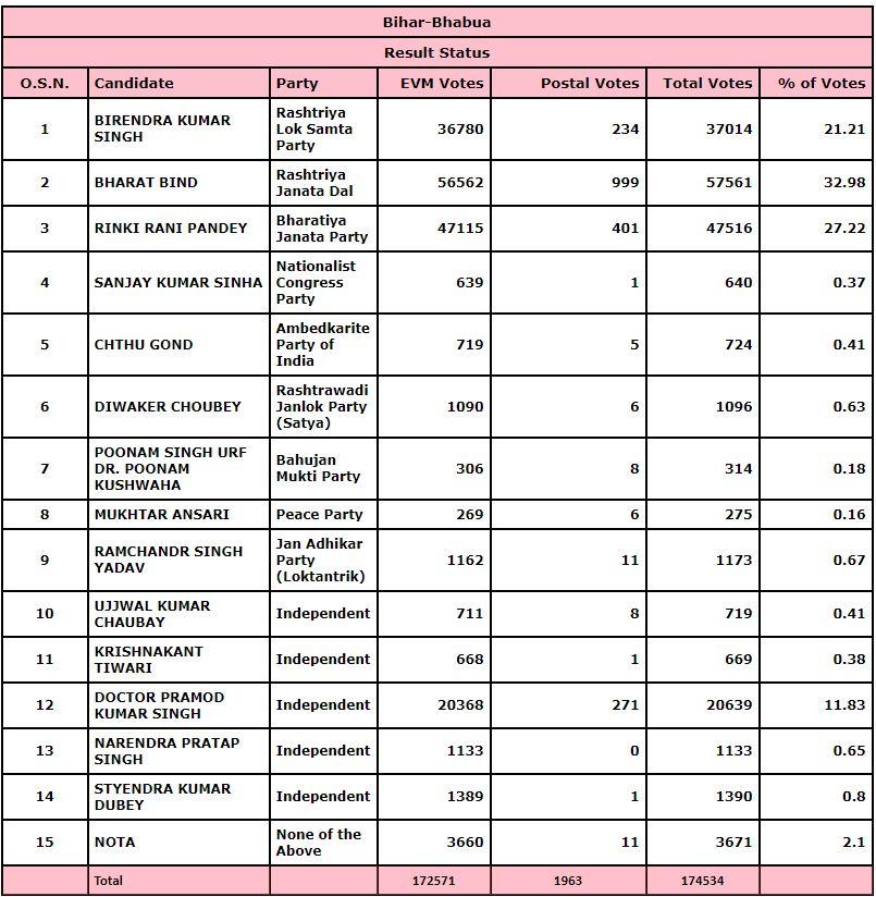 बिहार की भभुआ विधानसभा सीट (Bhabua Assembly Seat) पर आरजेडी-बीजेपी के बीच कांटे की टक्कर देखने को मिली. महागठबंधन की और से चुनाव मैदान में उतरे राजद प्रत्याशी भरत बिंद ने जीत का परचम लहराया. उन्होंने एनडीए खेमे से बीजेपी प्रत्याशी रिंकी पांडेय को शिकस्त दी है. भरत बिंद ने 10045 वोटों से रिंकी पांडेय को हराया है. बता दें कि भभुआ विधानसभा सीट पर इस बार 28 अक्टूबर को वोट डाले गए, यहां कुल 63.01% मतदान हुआ.