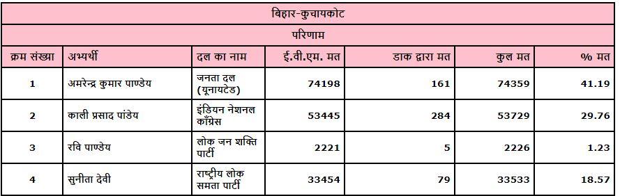 अमरेंद्र उर्फ पप्पू पांडे को गोपालगंज के कुचायकोट से जीत मिली है. जेडीयू उम्मीदवार पप्पू पांडे ने महागठबंधन की सहयोगी कांग्रेस के काली पांडे को करीब 21 हजार से भी ज्यादा वोट से हराया है. इस सीट पर रालोसपा की उम्मीदवार सुनीता देवी ने भी जबरदस्त टक्कर दी है. सुनीता देवी को 33 हजार से ज्यादा वोट मिले हैं.