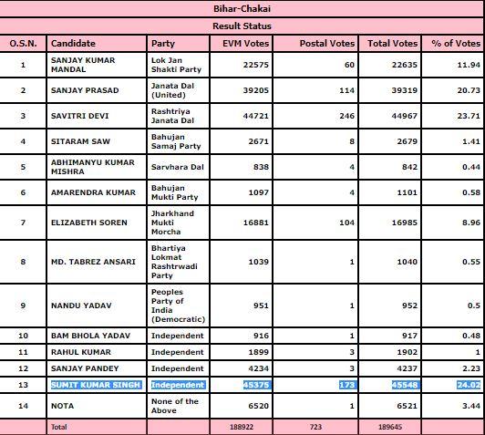 बिहार की चकाई विधानसभा सीट पर निर्दलीय सुमित कुमार सिंह ने जीत हासिल की है. उन्होंने एक बेहद कड़े मुकाबले में आरजेडी की सावित्री देवी को हराया है. इससे पहले इस सीट पर सावित्री देवी का कब्जा था.