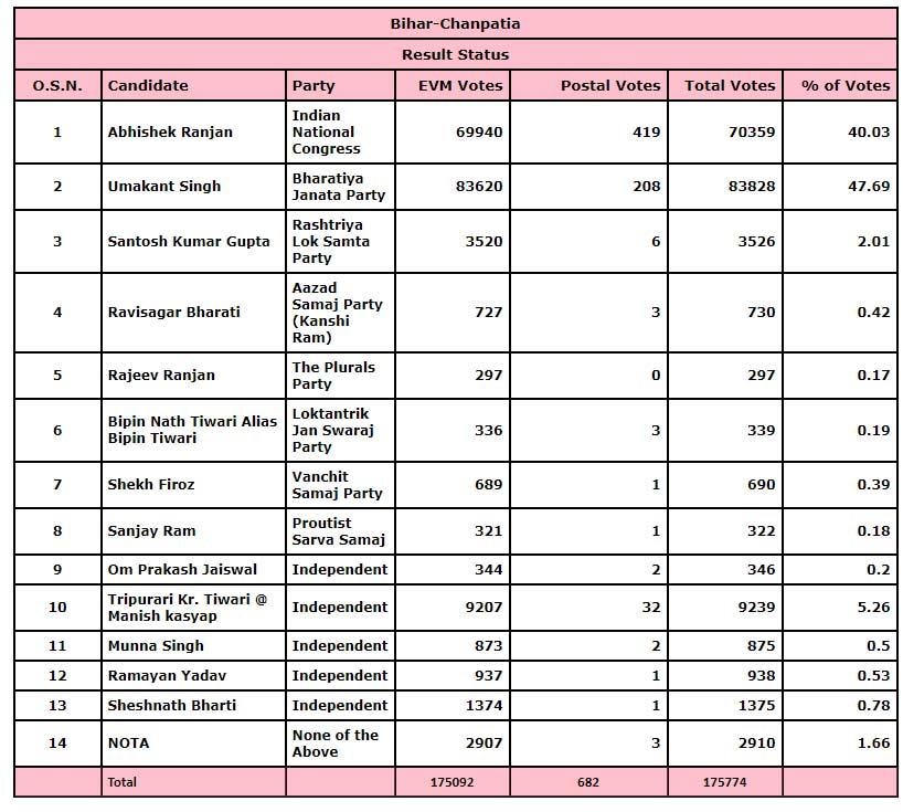 चनपटिया विधानसभा सीट पर भारतीय जनता पार्टी (बीजेपी) को जीत मिली है. बीजेपी के उमाकांत सिंह ने कांग्रेस के अभिषेक राजन को 13469 मतों के अंतर से हराया. पहले यह सीट बीजेपी के ही खाते में थी लेकिन 2015 के चुनाव में प्रकाश राय को जीत मिली थी. पिछले चुनाव में जीत का अंतर महज 464 वोटों का था.