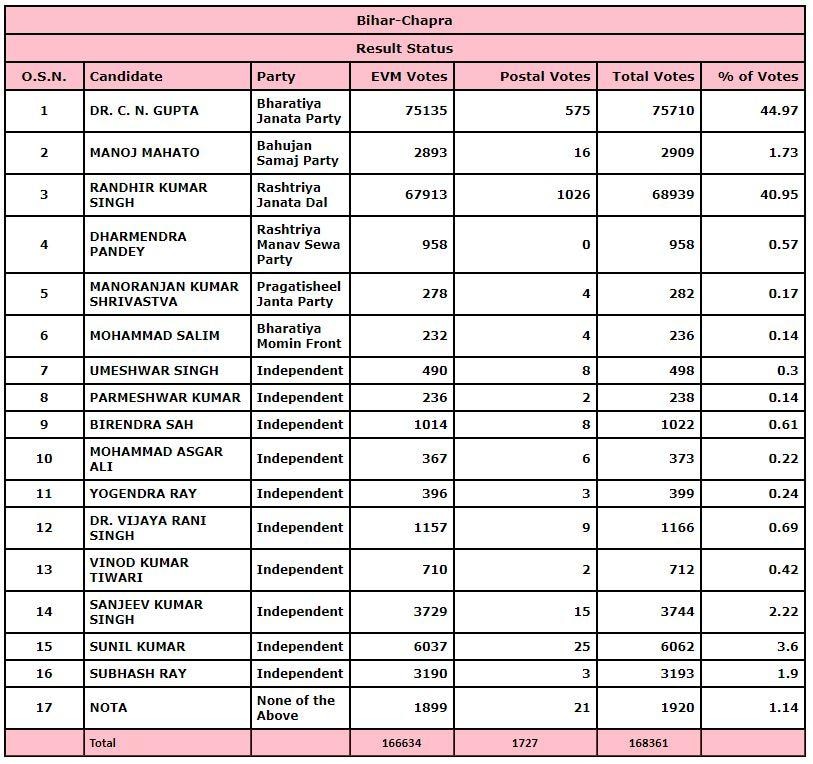 छपरा को बिहार के पूर्व मुख्यमंत्री लालू प्रसाद यादव का गढ़ माना जाता है. हलांकि पिछले चुनाव में इस सीट पर बीजेपी नेता सीएन गुप्ता ने जीत दर्ज की थी और आरजेडी नेता व पूर्व विधायक रणधीर सिंह को 11 हजार से ज्यादा मतों के अंतर से हराया था.