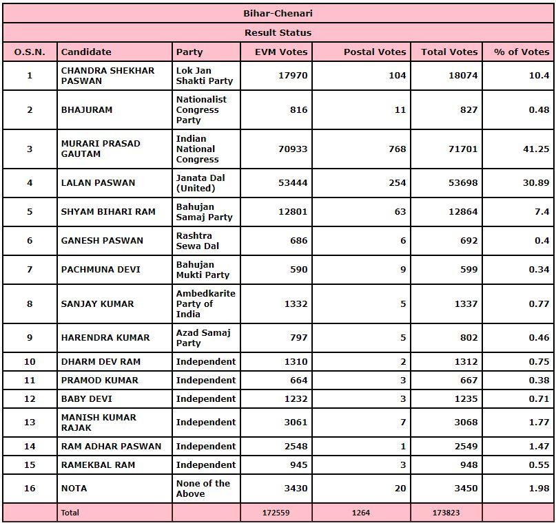 बिहार की चेनारी विधानसभा सीट (Chenari Assembly Seat) पर दिलचस्प मुकाबले में महागठबंधन की ओर से कांग्रेस उम्मीदवार ने जीत हासिल की है. महागठबंधन से कांग्रेस प्रत्याशी मुरारी प्रसाद ने एनडीए खेमे से जेडीयू (JDU) प्रत्याशी ललन पासवान को 18003 वोटों से हराया है. रोहतास जिले में आने वाली चेनारी विधानसभा सीट अनुसूचित जाति के लिए आरक्षित है. चेनारी विधानसभा सीट पर इस बार 28 अक्टूबर को वोट डाले गए, यहां कुल 56.98% मतदान हुआ. बता दें कि चेनारी विधानसभा सीट पर 2015 के चुनाव में जेडीयू का कब्जा रहा और ललन पासवान ने जीत का परचम लहराया था.