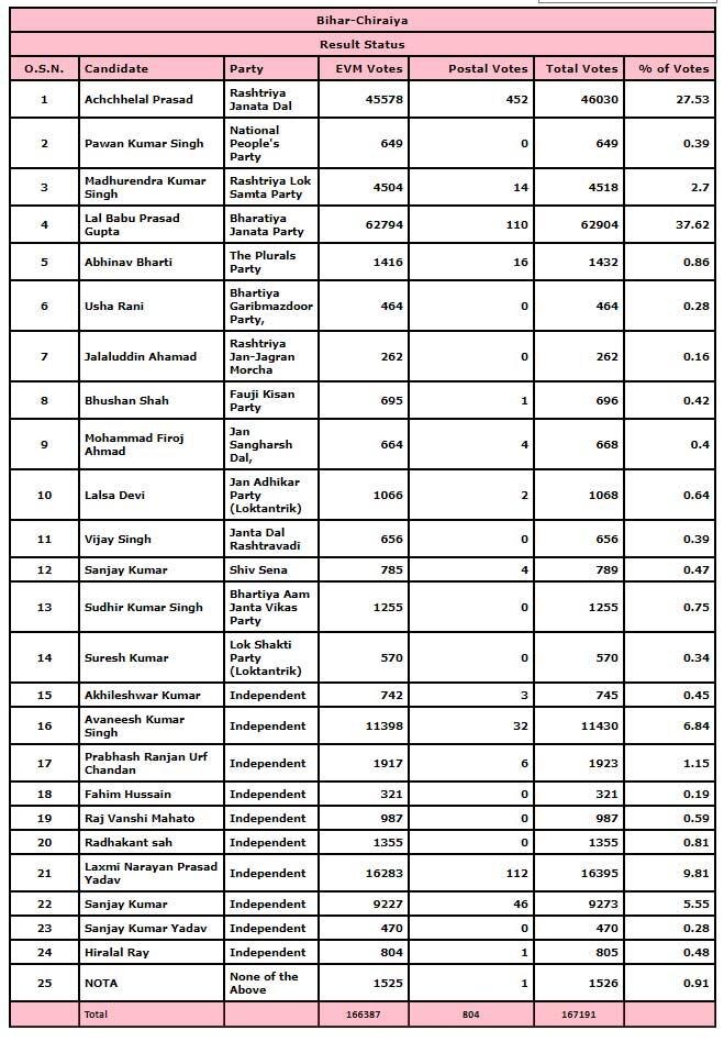 चिरैया विधानसभा सीट पर इस बार कुल 41 लोगों ने नामांकन दाखिल किया था जिसमें 38 आवेदन सही पाए गए. जबकि 1 की उम्मीदवारी खारिज हो गई. इस तरह से इस सीट पर 24 उम्मीदवारों के बीच मुकाबला है. चिरैया सीट पर तीसरे चरण में 7 नवंबर को मतदान कराए गए. चुनाव के पहले चरण में 28 अक्टूबर को 16 जिलों की 71 सीटों पर मतदान हुआ तो दूसरे चरण में 3 नवंबर को 17 जिलों की 94 विधानसभा सीटों पर वोटिंग हुई. जबकि तीसरे चरण (7 नवंबर) में 78 सीटों पर मतदान हुआ. वोटों की गिनती 10 नवंबर को की जाएगी.