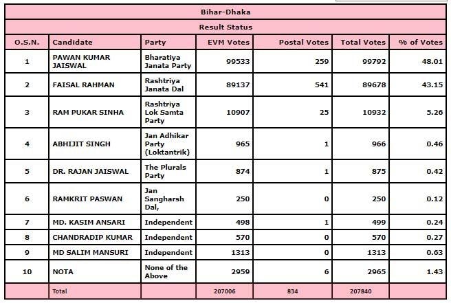 ढाका विधानसभा सीट पर मुकाबला उतार-चढ़ाव वाला रहा. लेकिन भारतीय जनता पार्टी ने यहां से जीत हासिल की. बीजेपी के पवन कुमार जायसवाल ने राष्ट्रीय जनता दल के फैसल रहमान को 10114 मतों के अंतर से हराया. फैसल रहमान ने पिछली बार जीत हासिल की थी.