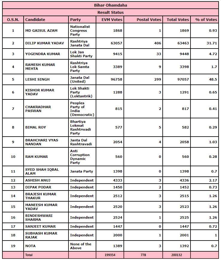 बिहार विधानसभा की सभी 243 सीटों के नतीजे घोषित हो चुके हैं. धमदाहा सीट से जेडीयू की लेशी ने जीत दर्ज की है. उन्होंने आरजेडी के दिलीप कुमार यादव को 33594 वोटों से हराया. इस सीट पर तीसरे चरण के तहत 7 नवंबर को 63.13% वोटिंग हुई थी. धमदाहा से 18 उम्मीदवार मैदान में थे.