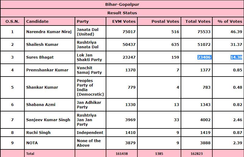 गोपालपुर सीट से जेडीयू के नरेंद्र कुमार नीरज ने जीत हासिल की है. भागलपुर लोकसभा क्षेत्र में आने वाली इस सीट पर नरेंद्र कुमार नीरज ने आरजेडी के शैलेश कुमार को 24461 मतों से मात दी. नरेंद्र कुमार नीरज को 75533 (46.39) वोट मिले जबकि शैलेश कुमार को 51072(31.37%) वोट मिले वहीं लोक जनशक्ति पार्टी (एलजेपी) के सुरेश भगत को 23406 (14.38) मतों के साथ तीसरे स्थान पर रहना पड़ा.