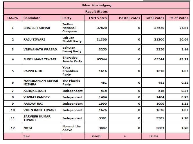 गोविंदगंज विधानसभा सीट पर कुल 11 उम्मीदवार मैदान में है जिसमें मुख्य मुकाबला भारतीय जनता पार्टी के सुनील मणि तिवारी और कांग्रेस के ब्रजेश कुमार के बीच है. लोक जनशक्ति पार्टी की ओर से राजू तिवारी मैदान में हैं. पिछला चुनाव राजू तिवारी ने जीता था. लोक जनशक्ति पार्टी ने तब एनडीए के साथ मिलकर चुनाव लड़ा लेकिन इस बार वह एनडीए से अलग हो गई है.