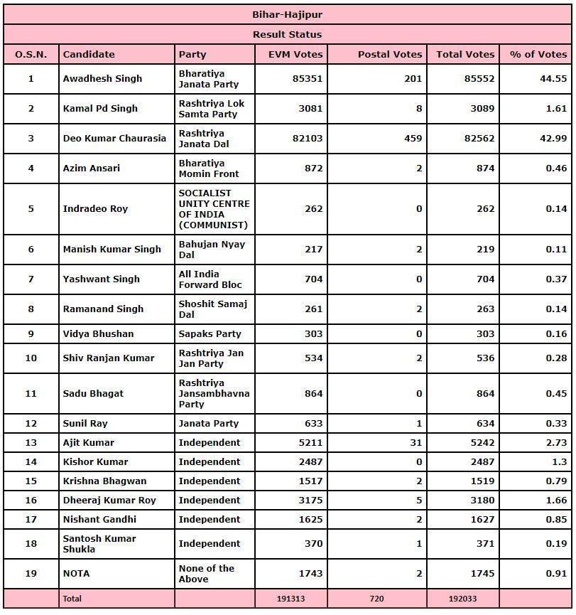 बता दें कि बीजेपी सांसद नित्यानंद राय की एंट्री के बाद से इस सीट पर अन्य कोई भी दल जीत हासिल नहीं कर सका है. यानी हाजीपुर में 1995 के बाद से बीजेपी के अलावा किसी और पार्टी को यहां से जीत हासिल नहीं हुई. इस विधानसभा सीट पर इस बार 3 नवंबर को वोट डाले गए, यहां कुल 57.29% मतदान हुआ.
