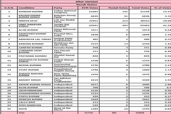 बिहार की हरनौत विधानसभा सीट पर जेडीयू के हरि नारायण सिंह को जीत मिली है. उन्होंने एलजेपी की ममता देवी को मात दी है. हरि नारायण सिंह ने 27 हजार से ज्यादा वोटों से जीत हासिल की. वहीं, कांग्रेस यहां पर तीसरे स्थान पर रही. कांग्रेस के कुंदन कुमार को 21144 वोट मिले. चुनाव आयोग के आंकड़े के मुताबिक, हरि नारायण सिंह को 65404 वोट मिले. वहीं ममता देवी के खाते में 38163 वोट पड़े.