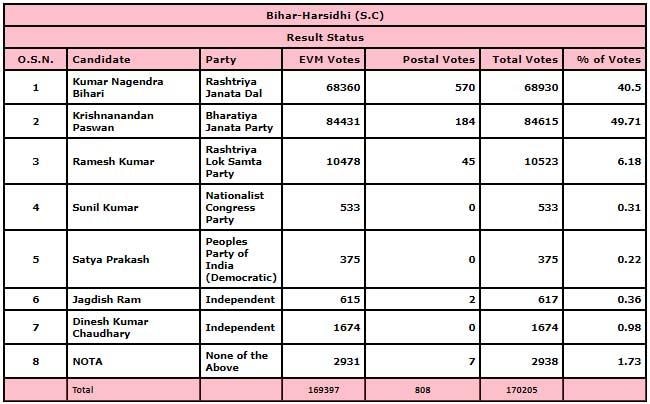 बिहार की हरसिद्धी विधानसभा सीट पर भारतीय जनता पार्टी को बड़ी जीत मिली है. बीजेपी के कृष्णानंदन पासवान ने आरजेडी के उम्मीदवार कुमार नगेंद्र बिहारी को 15685 मतों के अंतर से हराया. पिछली बार आरजेडी के राजेंद्र कुमार ने जीत हासिल की थी.