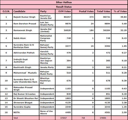 हथुआ विधानसभा सीट पर 3 नवंबर 2020 को मतदान हुआ. इस सीट पर आरजेडी की ओर से राजेश कुमार सिंह और जेडीयू की ओर से रामसेवक सिंह को टिकट दी. यहां 57.10 फीसदी वोटिंग हुई. इस सीट पर आरजेडी ने जीत हासिल की है. आरजेडी के राजेश कुमार को 86731 वोट मिले. इसके अलावा जेडीयू के रामसेवक को 56204 वोट हासिल हुए हैं.