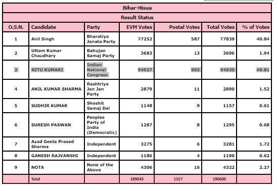 इस चुनाव में कांग्रेस को कुल 94930 वोट मिले, जबकि बीजेपी के खाते में 77839 वोट गए हैं. हिसुआ विधानसभा सीट पर पहले चरण में मतदान हुआ था. इस दौरान 50.32 फीसदी लोगों ने वोट डाले थे.
