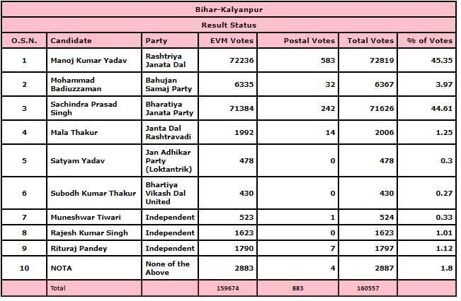 बिहार की कल्याणपुर विधानसभा सीट से भारतीय जनता पार्टी (बीजेपी) को जोर का झटका लगा है. उसके उम्मीदवार सचिन्द्र सिंह को हार मिली है. राष्ट्रीय जनता दल (आरजेडी) के मनोज कुमार यादव ने बेहद कड़े मुकाबले में सचिन्द्र सिंह को मात दी. मनोज को 1193 मतों के अंतर से जीत मिली है. सचिन्द्र सिंह पिछली बार विजयी रहे थे.