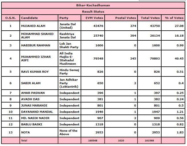 बिहार विधानसभा की सभी 243 सीटों पर मतगणना देर रात तक खत्म हुई. कोचाधामन सीट से AIMIM ने बाजी मारी. AIMIM के MUHAMMED IZHAR ASFI ने जेडीयू के MUJAHID ALAM को 36143 मतों से हराया. कोचाधामन से 12 उम्मीदवार मैदान में थे. यहां तीसरे चरण के तहत 7 नवंबर को 67.1% वोटिंग हुई थी.