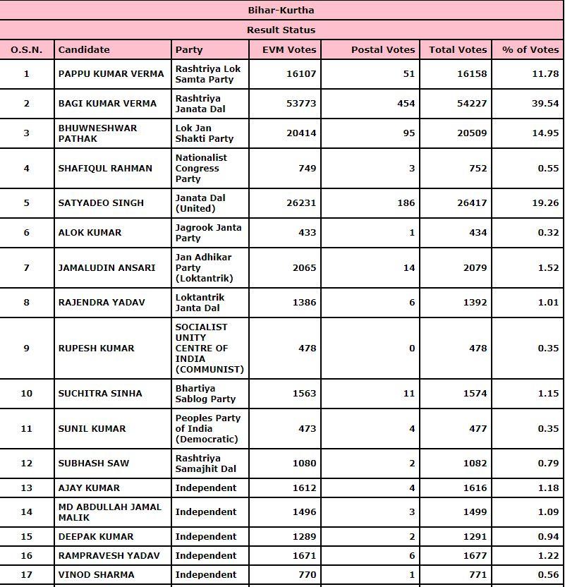 बिहार की कुर्था विधानसभा सीट पर महागठबंधन की ओर से आरजेडी और एनडीए खेमे से जेडीयू (JDU) के बीच दिलचस्प मुकाबला देखने को मिला. दोनों ही पार्टियों के बीच कांटे की टक्कर में आरजेडी प्रत्याशी बागी कुमार वर्मा ने जीत का परचम लहराया है. उन्होंने जेडीयू नेता सत्यदेव सिंह को 27810 वोटों से हराया है. बिहार के अरवल जिले में आने वाली कुर्था विधानसभा सीट कई मायनों में अहम है. इस सीट पर यादव, कोइरी और भूमिहार जाति के मतदाता निर्णायक होते हैं. कुर्था विधानसभा सीट पर इस बार 28 अक्टूबर को वोट डाले गए और कुल 55.58% मतदान हुआ.