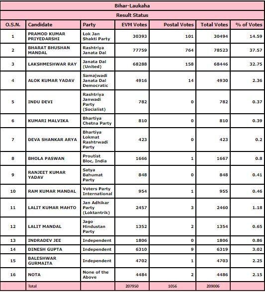 2015 के विधानसभा चुनाव में जनता दल युनाइटेड के लक्ष्मेश्वर राय ने भारतीय जनता पार्टी के उम्मीदवार प्रमोद कुमार प्रियदर्शी को चुनावी समर में मात दी थी. 79,971 वोट जेडीयू को पड़े थे, वहीं बीजेपी को 56,138 मत हासिल हुए थे. जीत का अंतर 23,833 था. इस चुनाव में कुल 59 फीसदी लोगों ने वोट किया था. 14 लोग चुनावी महासमर में उतरे थे, जिनमें से 3 महिलाएं थीं. 12 प्रत्याशियों की जमानत जब्त हो गई थी. इस सीट पर 2005 से ही जनता दल यूनाइटेड का कब्जा बरकरार है. 2005 में हरि प्रसाद साह, फिर 2010 में भी हरि प्रसाद साह विजयी हुए. उन्होंने आरेजडी के चितरंजन प्रसाद यादव को मात दी थी.
