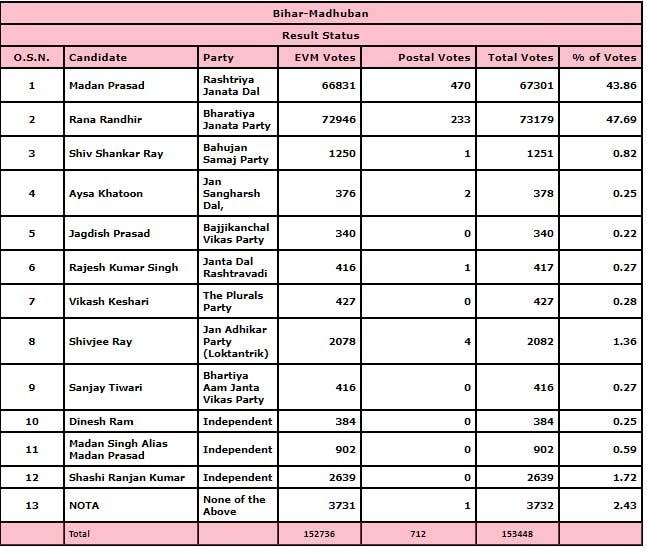 भारतीय जनता पार्टी (बीजेपी) के उम्मीदवार राणा रणधीर ने नामांकन के 4 सेट दाखिल किए थे. मधुबन सीट पर दूसरे चरण में 3 नवंबर को मतदान कराया गया. बिहार विधानसभा चुनाव के पहले चरण में 28 अक्टूबर को 16 जिलों की 71 सीटों पर मतदान होने के बाद अब दूसरे चरण में 3 नवंबर को 17 जिलों की 94 विधानसभा सीटों पर वोटिंग हुई. तीसरे चरण (7 नवंबर) में 78 सीटों पर मतदान हुआ.