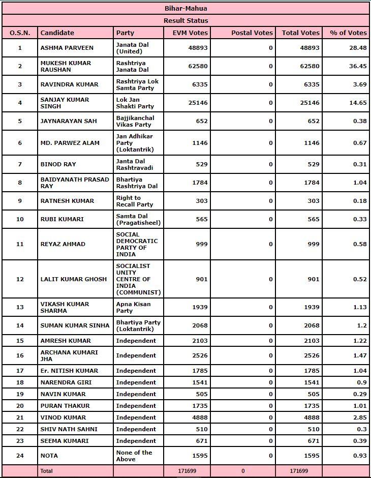 बिहार की महुआ विधानसभा सीट पर आरजेडी उम्मीदवार मुकेश कुमार रौशन ने आरजेडी का विजयी पताखा लहरा दिया है. उन्होंने जेडीयू की आश्मा प्रवीण को 13687 वोटों के अंतर से हरा दिया है. हालांकि उनकी जीत में लोजपा उम्मीदवार संजय कुमार सिंह ने बड़ी भूमिका निभाई है. दरअसल इस सीट पर लोजपा उम्मीदवार संजय कुमार सिंह को 25 हजार से ज्यादा वोट प्राप्त हुए हैं. माना जाता है कि अगर लोजपा एनडीए का हिस्सा होती तो ये सीट जेडीयू के खाते में जाती.