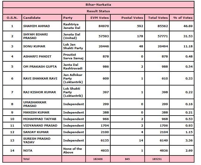 बिहार की नरकटिया विधानसभा सीट पर राष्ट्रीय जनता दल के शमीम अहमद और जनता दल यूनाइटेड के श्याम बिहारी प्रसाद के बीच टक्कर रहा जिसमें शमीम अहमद ने बाजी मारी. उन्होंने 27791 मतों के अंतर से जीत हासिल की. पिछले चुनाव में वह 19982 मतों के अंतर से जीते थे.
