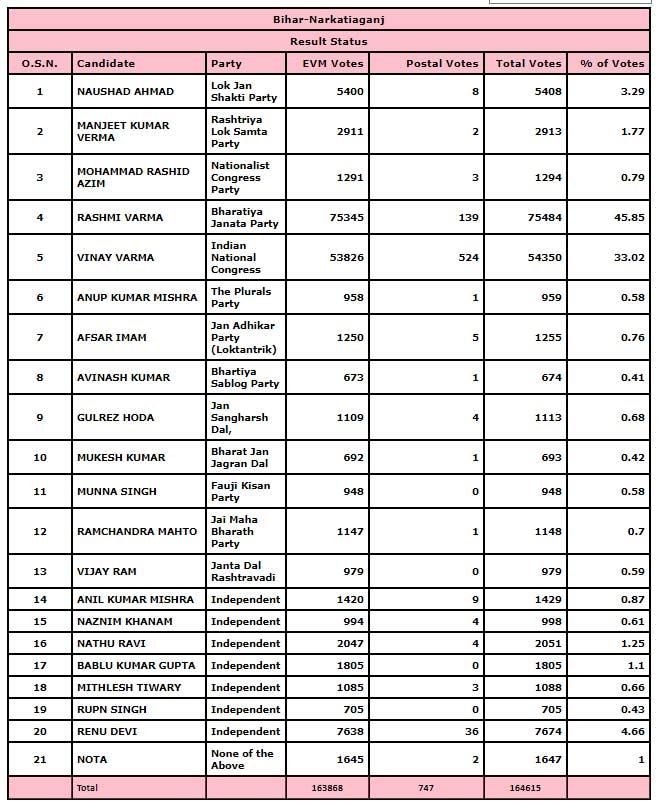 नरकटियागंज सीट पर 59.40 फीसदी मतदान हुआ. पुरुषों की तुलना में महिलाओं ने ज्यादा वोट डाले. नरकटियागंज विधानसभा सीट पर कुल 22 उम्मीदवार मैदान में है जिसमें मुख्य मुकाबला भारतीय जनता पार्टी की रश्मी वर्मा और कांग्रेस के विनय वर्मा के बीच है. जन अधिकार पार्टी (लोकतांत्रिक) की ओर से नौशाद अहमद भी मैदान में हैं.