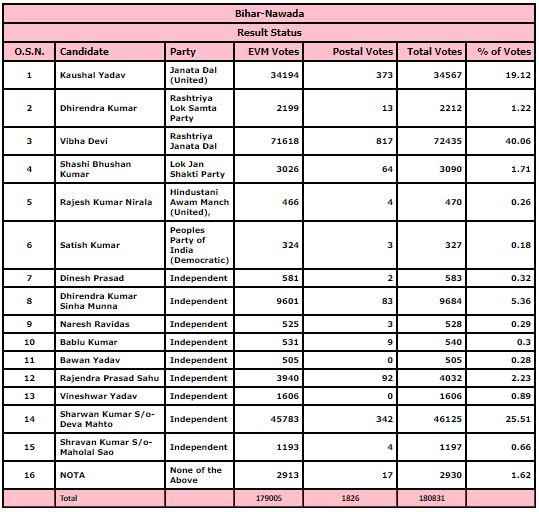 विभा देवी इस चुनाव में 72435 वोट मिले, जबकि निर्दलीय उम्मीदवार श्रवण कुमार को 46125 मत मिले. तीसरे नंबर पर रहने वाले कौशल यादव को 34567 वोट मिले हैं. बता दें कि बिहार की वीआईपी सीट में से एक नवादा विधानसभा सीट पर तीन दशक से पूर्व विधायक राजवल्लभ यादव और वर्तमान विधायक कौशल यादव के परिवारों का ही कब्जा है.