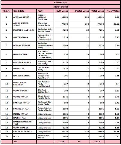 पारू विधानसभा सीट पर 3 नवंबर 2020 को मतदान हुआ. इस सीट से कांग्रेस के अनुनय सिन्हा, आरएलएसपी के मदन चौधरी तो वहीं बीजेपी के अशोक कुमार सिंह मैदान में हैं. इस सीट पर 60.11 फीसदी वोटिंग हुई. वहीं इस बार पारू से अशोक कुमार सिंह एक बार फिर से जीत गए हैं. अशोक कुमार को 77392 वोट हासिल हुए. वहीं कांग्रेस के अनुनय सिंह को 13961 वोट मिले. इसके अलावा निर्दलीय शंकर प्रसाद को 62694 वोट मिले हैं.