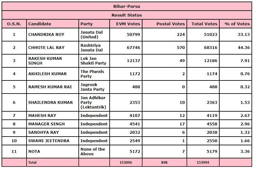 बता दें कि बिहार में तीन चरणों में हुए चुनावों में इस बार कुल 59.94 फीसदी वोटिंग हुई है. परसा विधानसभा सीट पर इस बार 3 नवंबर को वोट डाले गए, यहां कुल 57.79% मतदान हुआ.