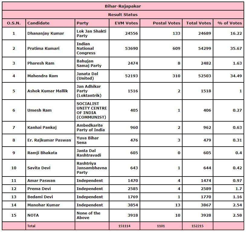 बिहार की राजापाकड़ विधानसभा सीट पर इस बार चुनावी परिणाम बदल गए हैं और कांग्रेस उम्मीदवार प्रतिमा कुमारी ने जेडीयू को चारो खाने चित कर दिया है. उन्होंने जेडीयू के महेंद्र राम को 1796 वोटों के अंतर से हरा दिया. उनकी जीत में सबसे अहम भूमिका लोजपा उम्मीदवार धनंजय कुमार ने निभाई जिन्हें 24 हजार से ज्यादा वोट मिले. बिहार के चुनावी राजनीति में राजापाकड़ विधानसभा सीट नई है और यहां सिर्फ दो बार चुनाव हुए हैं. वर्तमान में आरजेडी नेता शिवचंद्र राम यहां से विधायक हैं. बिहार की राजापाकड़ विधानसभा सीट पर इस बार 3 नवंबर को वोट डाले गए, यहां कुल 55.73% मतदान हुआ.