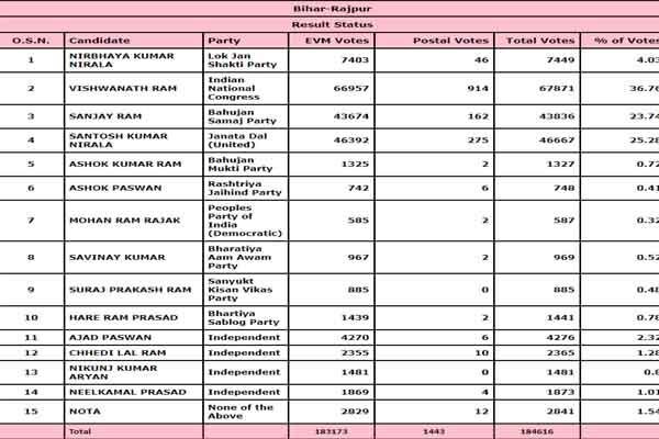 बिहार की राजगीर विधानसभा सीट पर कांग्रेस को जीत मिली है. कांग्रेस के विश्वनाथ राम को 20 हजार से ज्यादा वोटों से जीत मिली. उन्होंने जेडीयू के संतोष कुमार निराला को मात दी. चुनाव आयोग के आंकड़े के मुताबिक, विश्वनाथ राम को 67871 वोट मिले. वहीं संतोष कुमार निराला के खाते में 46667 वोट पड़े. यहां पर बसपा को भी अच्छा खासा वोट मिला है. बसपा के संजय राम को 43836 वोट मिले. इससे पहले 2015 के चुनाव में जेडीयू ने जीत हासिल की थी. जेडीयू के रवि ज्योति 5 हजार से ज्यादा वोटों से जीते थे.