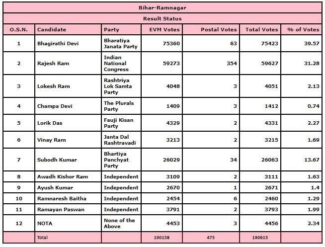 रामनगर (सुरक्षित) सीट पर 51.20 फीसदी मतदान हुआ. पुरुषों की तुलना में महिलाओं ने ज्यादा वोट डाले. रामनगर विधानसभा सीट पर कुल 11 उम्मीदवार मैदान में है जिसमें मुख्य मुकाबला भारतीय जनता पार्टी की भागीरथी देवी और कांग्रेस के राजेश राम के बीच है. जन अधिकार पार्टी (लोकतांत्रिक) की ओर से पप्पू कुमार राजन भी मैदान में हैं.
