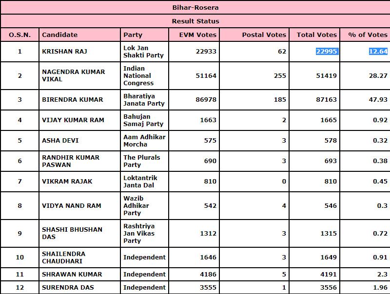 रोसड़ा विधासनभा सीट से भारतीय जनता पार्टी (बीजेपी) उम्मीदवार विरेंद्र कुमार ने जीत हासिल की है. समस्तीपुर जिले में आने वाली इस सीट पर विरेंद्र कुमार ने कांग्रेस के नागेंद्र कुमार विकल को 35744 मतों से मात दी है. विरेंद्र कुमार को 87163 (47.93%) मत मिले जबकि नागेंद्र कुमार विकाल को 51419(28.27%) मत मिले. वहीं एलजेपी उम्मीदवार को कृष्ण राज को 22995 (12.64%) वोट मिले.