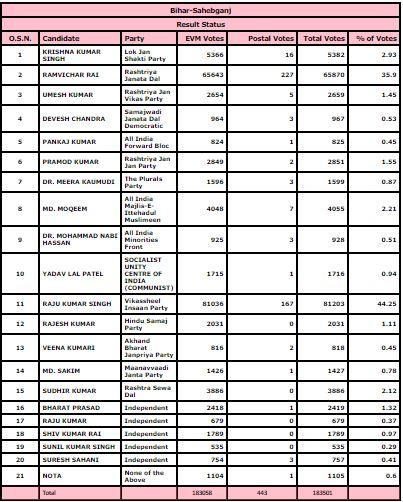 इस विधानसभा सीट पर 3 नवंबर 2020 को मतदान हुआ. इस बार इस सीट से राम विचार राय को आरजेडी ने टिकट दी. वहीं लोक जनशक्ति पार्टी ने कृष्ण कुमार सिंह को चुनावी मैदान में उतारा. इस सीट पर 59.31 फीसदी मतदान हुआ. इस सीट से विकासशील इंसान पार्टी के राजू कुमार सिंह जीते हैं. उनको 81203 वोट हासिल हुए. इसके बाद दूसरे नंबर पर अभी आरजेडी के राम विचार राय हैं, जिन्हें 65870 वोट मिले हैं.