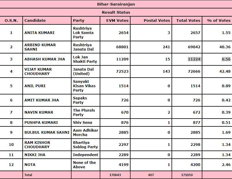 समस्तीपुर जिले में आने वाली सरायरंजन सीट जेडीयू उम्मीदवार विजय कुमार चौधरी ने जीत हासिल की है. उन्होंने राष्ट्रीय जनता दल (आरजेडी) के उम्मीदवार और अपने निकटतम प्रतिद्वंदी अरविंद कुमार सहनी को 3624 मतों से मात दी. नीतीश के करीबी माने जाने वाले विजय कुमार चौधरी को 72666 (42.48%) वोट मिले, जबकि अरविंद कुमार सहनी को 69042 (40.36%)मत मिले. एलजेपी उम्मीदवार आभाष कुमार झा को 11224 (6.56%) वोट मिले. इस सीट पर 7 नवंबर को हुए चुनाव में 60.84% मतदान दर्ज किया गया था.